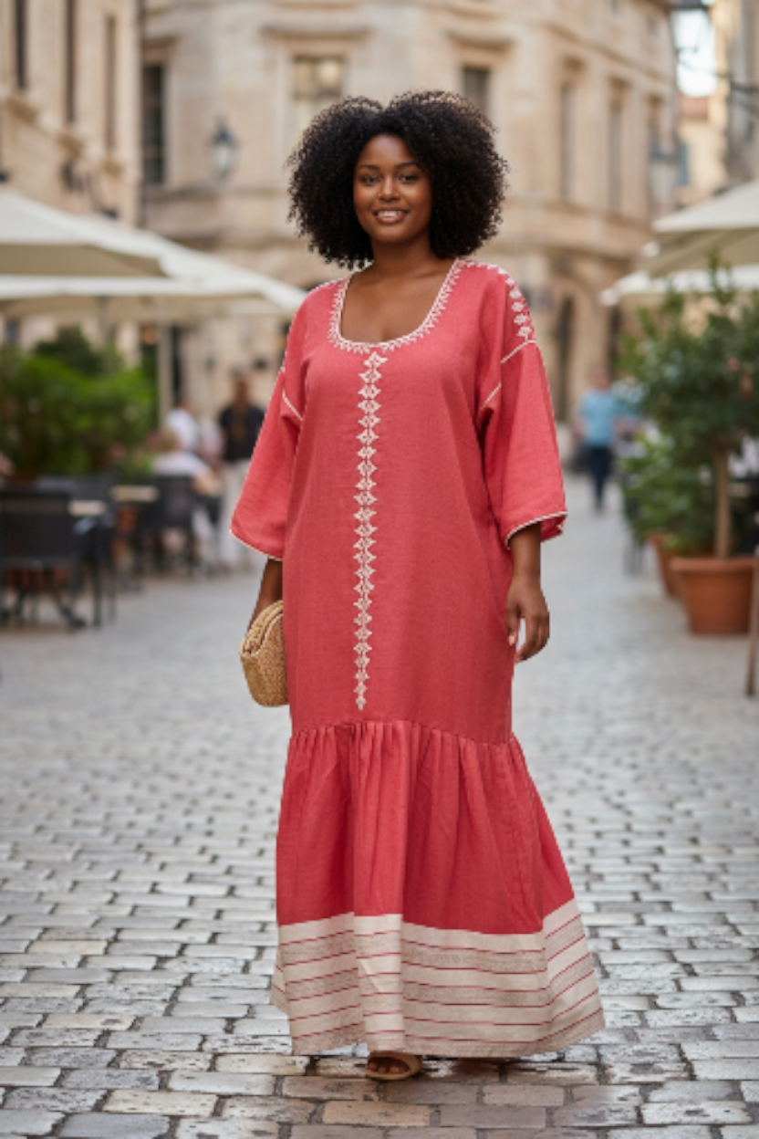 A graceful cotton dress adorned with delicate hand embroidery and deep-toned woven borders. Its relaxed silhouette and matching shawl blend comfort with timeless Ethiopian artistry—perfect for casual elegance or special occasions.