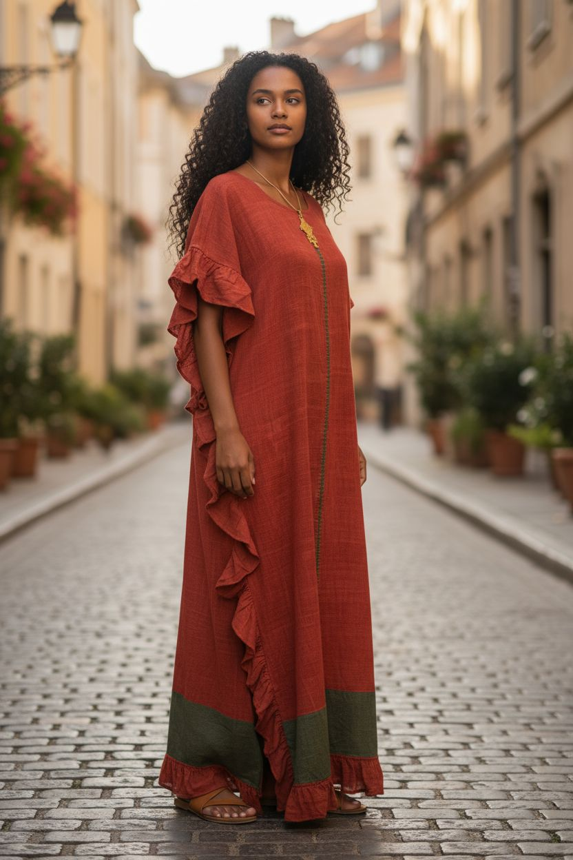 Small size , free flowing 100% organic cotton. This maxi dress with ruffles on the six is perfect for daily casual wear or for a formal feel with the right traditional or modern accessories.