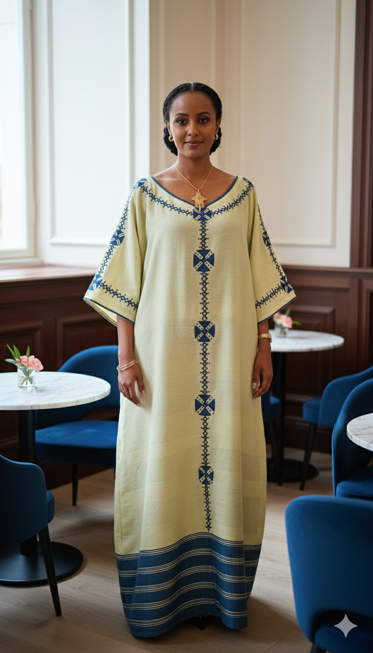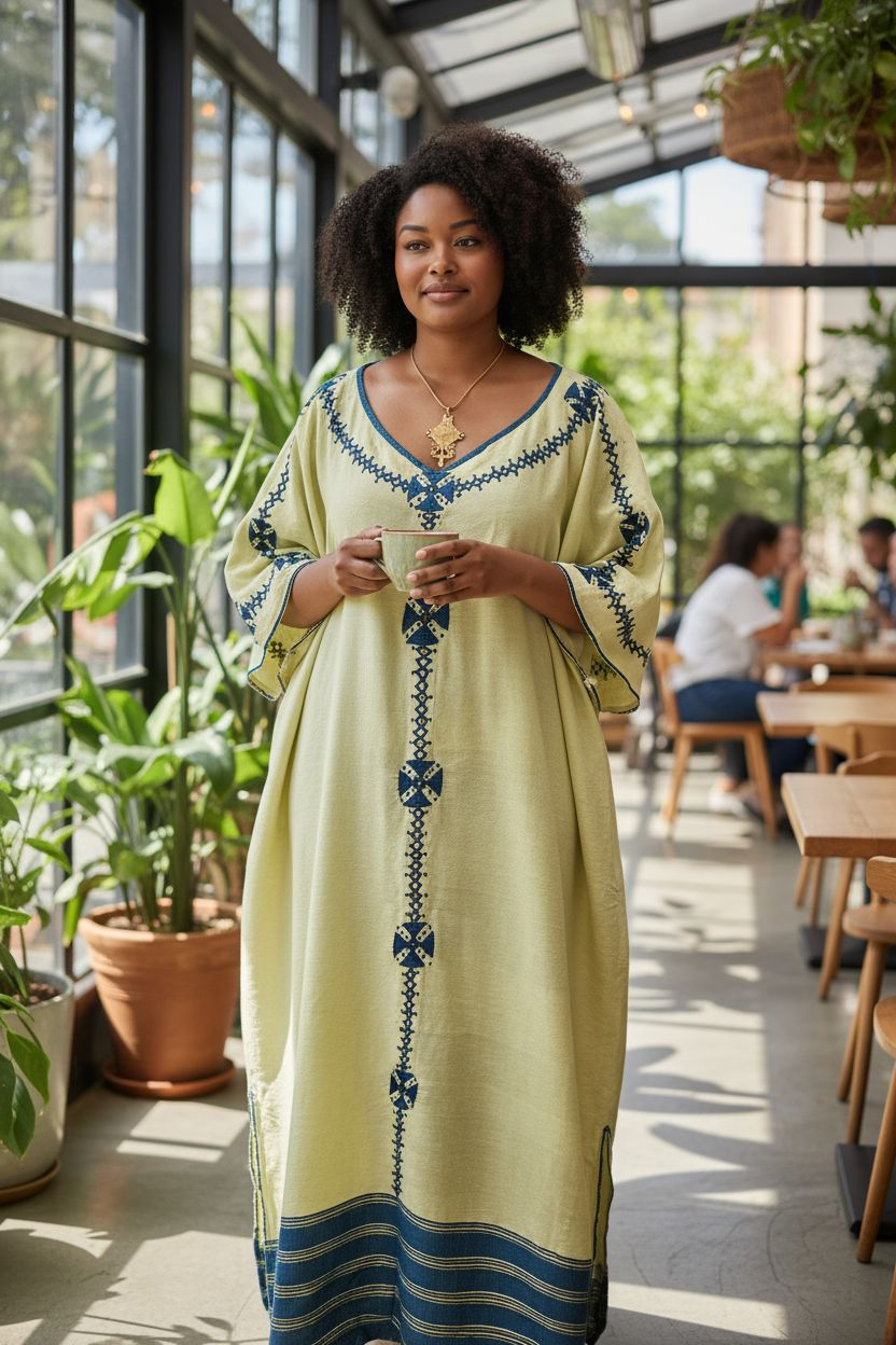 A graceful cotton dress adorned with delicate hand embroidery and deep-toned woven borders. Its relaxed silhouette and matching shawl blend comfort with timeless Ethiopian artistry—perfect for casual elegance or special occasions.