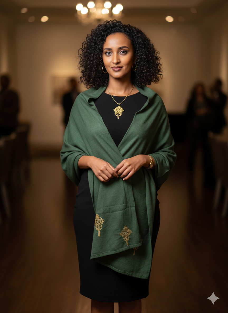 This sophisticated shawl blends cultural heritage with modern textile elegance. Crafted from a lightweight, fluid fabric that drapes beautifully, this piece features the iconic charcoal gray hue accented by striking gold embroidery. It is the perfect accessory for those who want the look of a traditional Netela with the airy, wrinkle-resistant qualities of modern materials.