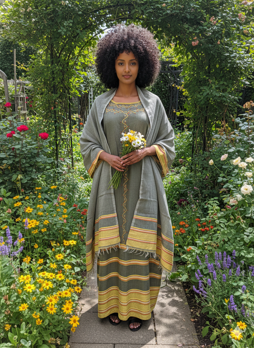 A graceful cotton dress adorned with delicate hand embroidery and deep-toned woven borders. Its relaxed silhouette and matching shawl blend comfort with timeless Ethiopian artistry—perfect for casual elegance or special occasions.