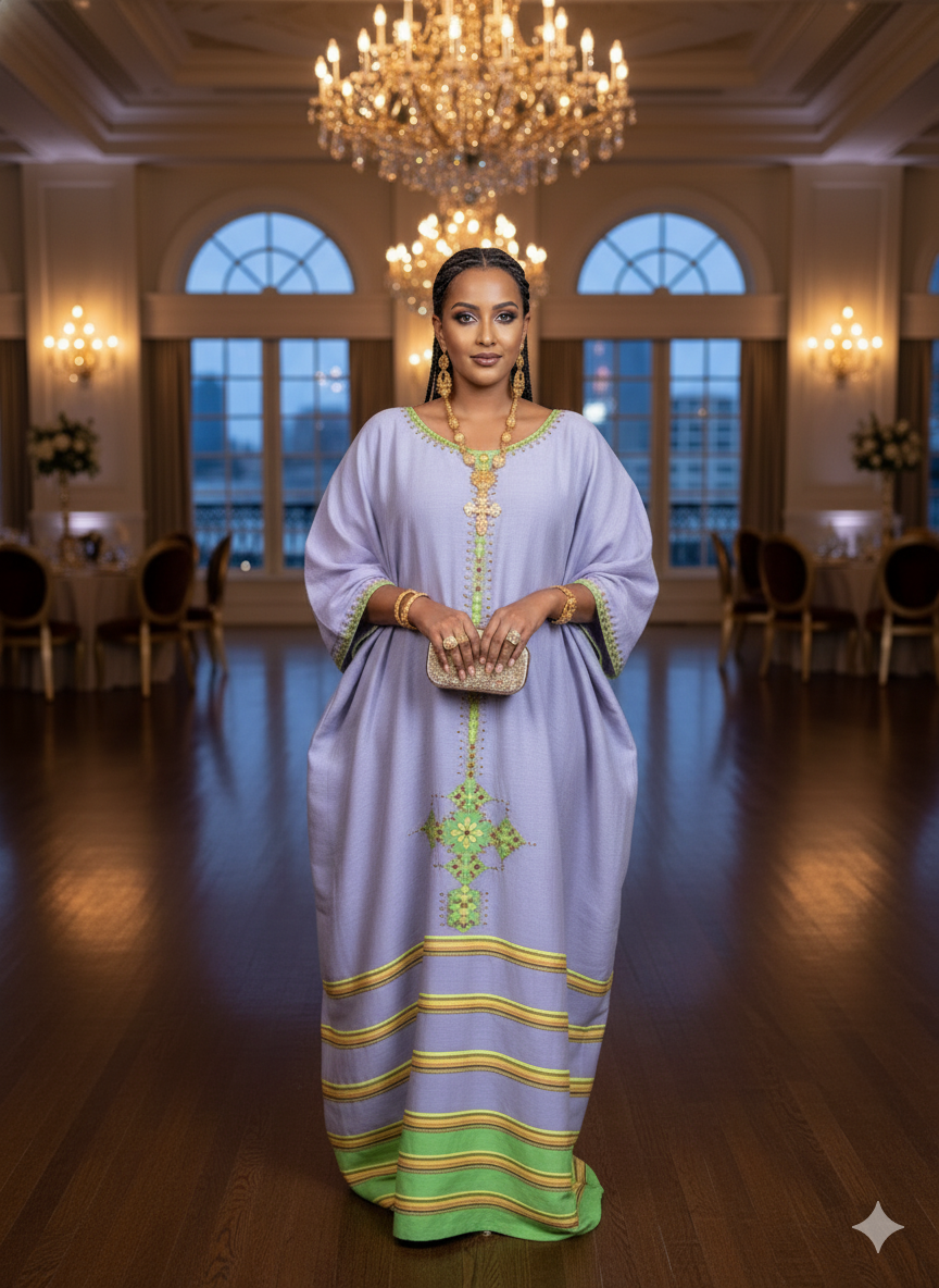 A graceful cotton dress adorned with delicate hand embroidery and deep-toned woven borders. Its relaxed silhouette and matching shawl blend comfort with timeless Ethiopian artistry—perfect for casual elegance or special occasions.