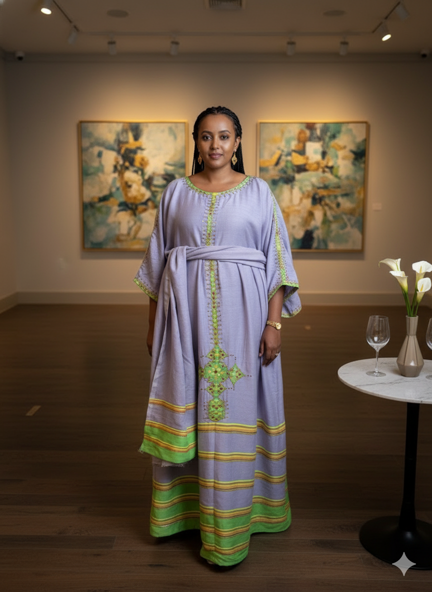 A graceful cotton dress adorned with delicate hand embroidery and deep-toned woven borders. Its relaxed silhouette and matching shawl blend comfort with timeless Ethiopian artistry—perfect for casual elegance or special occasions....