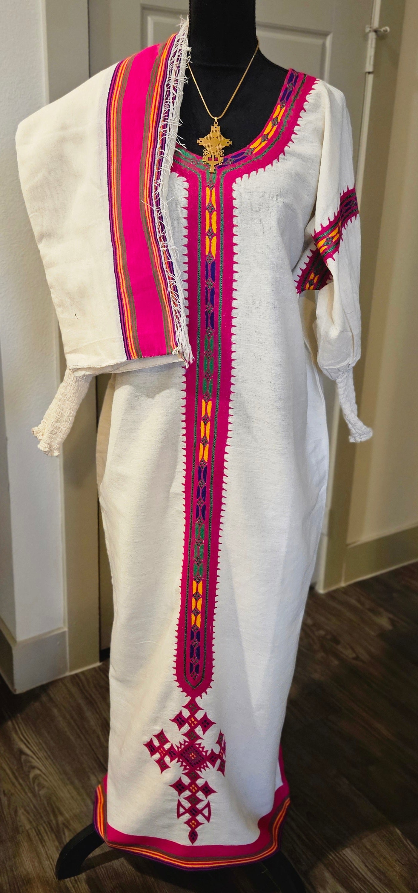 Elegant handwoven white cotton dress featuring bold purple accents and traditional Ethiopian cross embroidery — a timeless blend of heritage and modern grace. Comes with a full netela