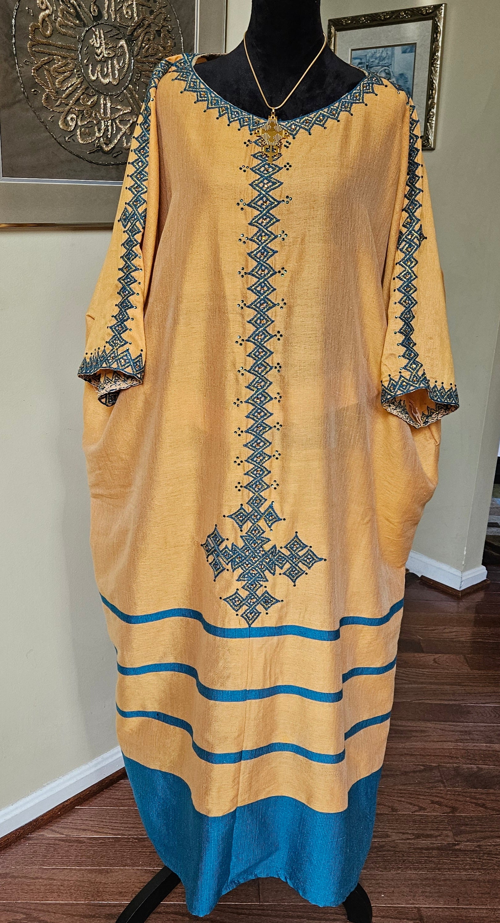 A graceful cotton dress adorned with delicate hand embroidery and deep-toned woven borders. Its relaxed silhouette and matching shawl blend comfort with timeless Ethiopian artistry—perfect for casual elegance or special occasions.