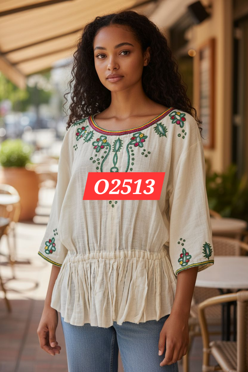 O2513 – Hand-Embroidered Cotton Top Light, hand-embroidered cotton blouse with floral green and red accents. Soft, airy, and cinched at the waist for a flattering fit — perfect for everyday wear.