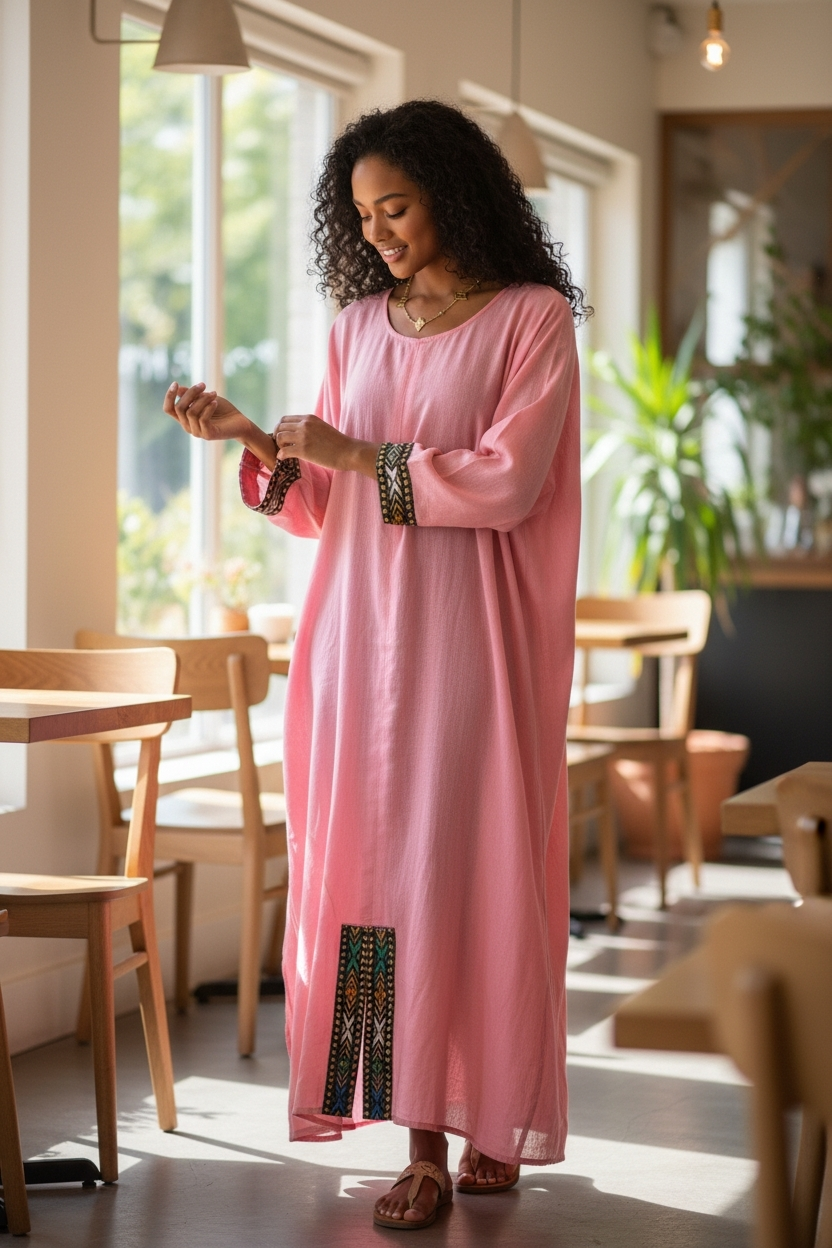 One size fits all, free flowing 100% organic cotton. This maxi dress is perfect for daily casual wear or for a formal feel with the right traditional or modern accessories.
