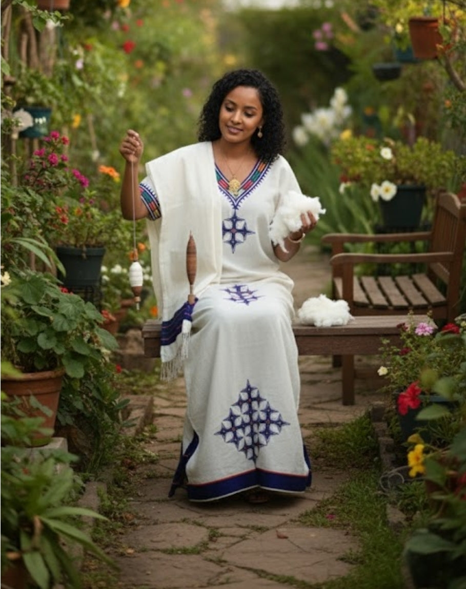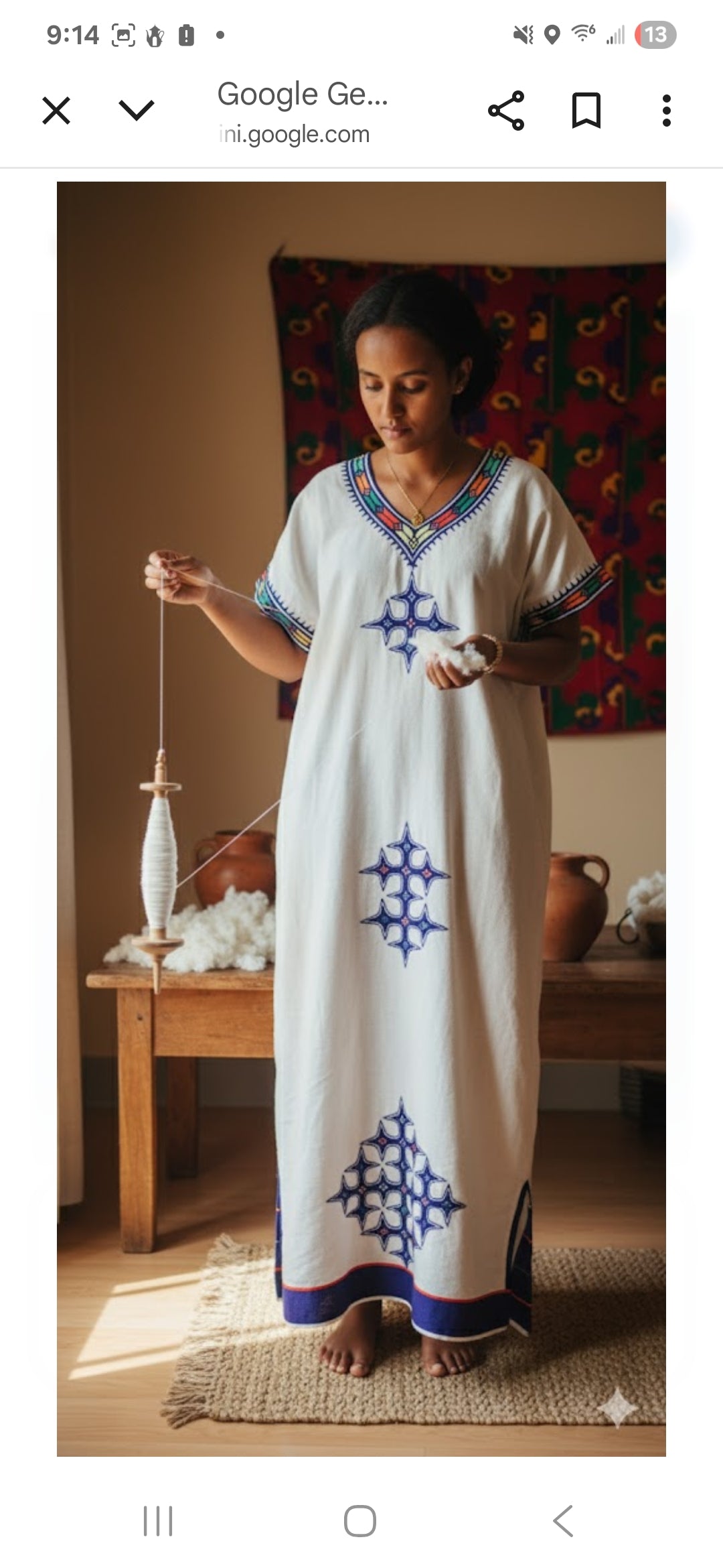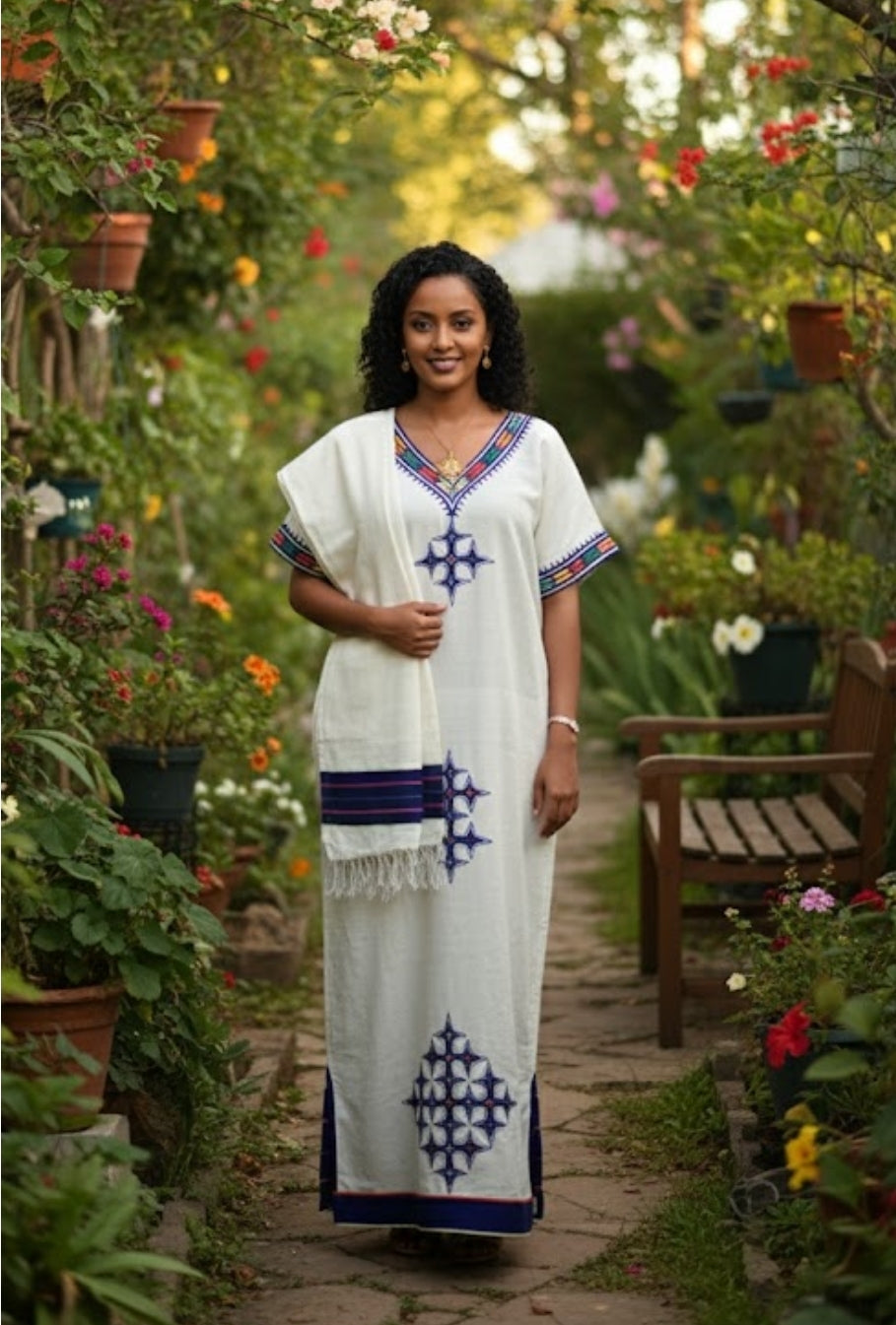 A one size, 100% hand woven cotton fabric, white with hand embroidered design and decoration at the front, neck, and sleeves. This piece comes with a full Netela. Perfect while seeking a unique, comfortable, but fashionable look. Casual as well as formal feel with the right traditional or modern accessories.