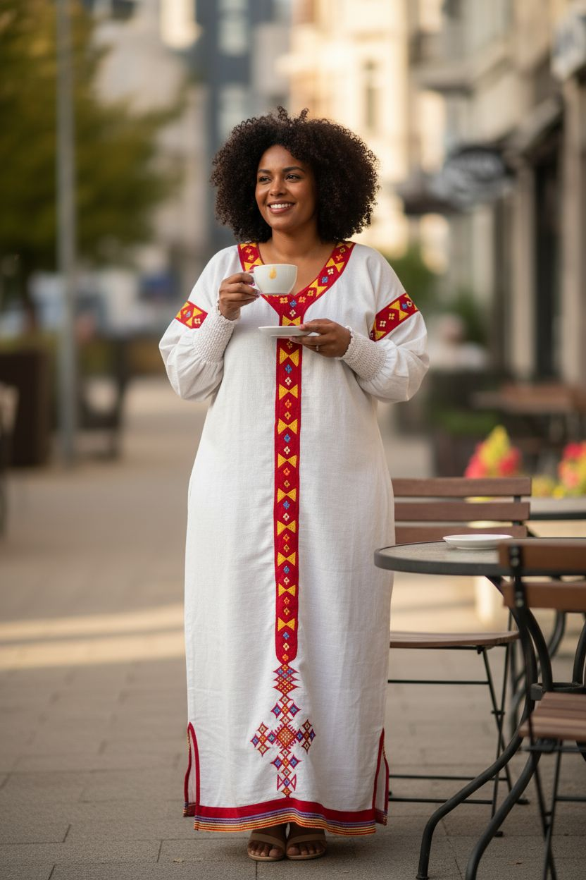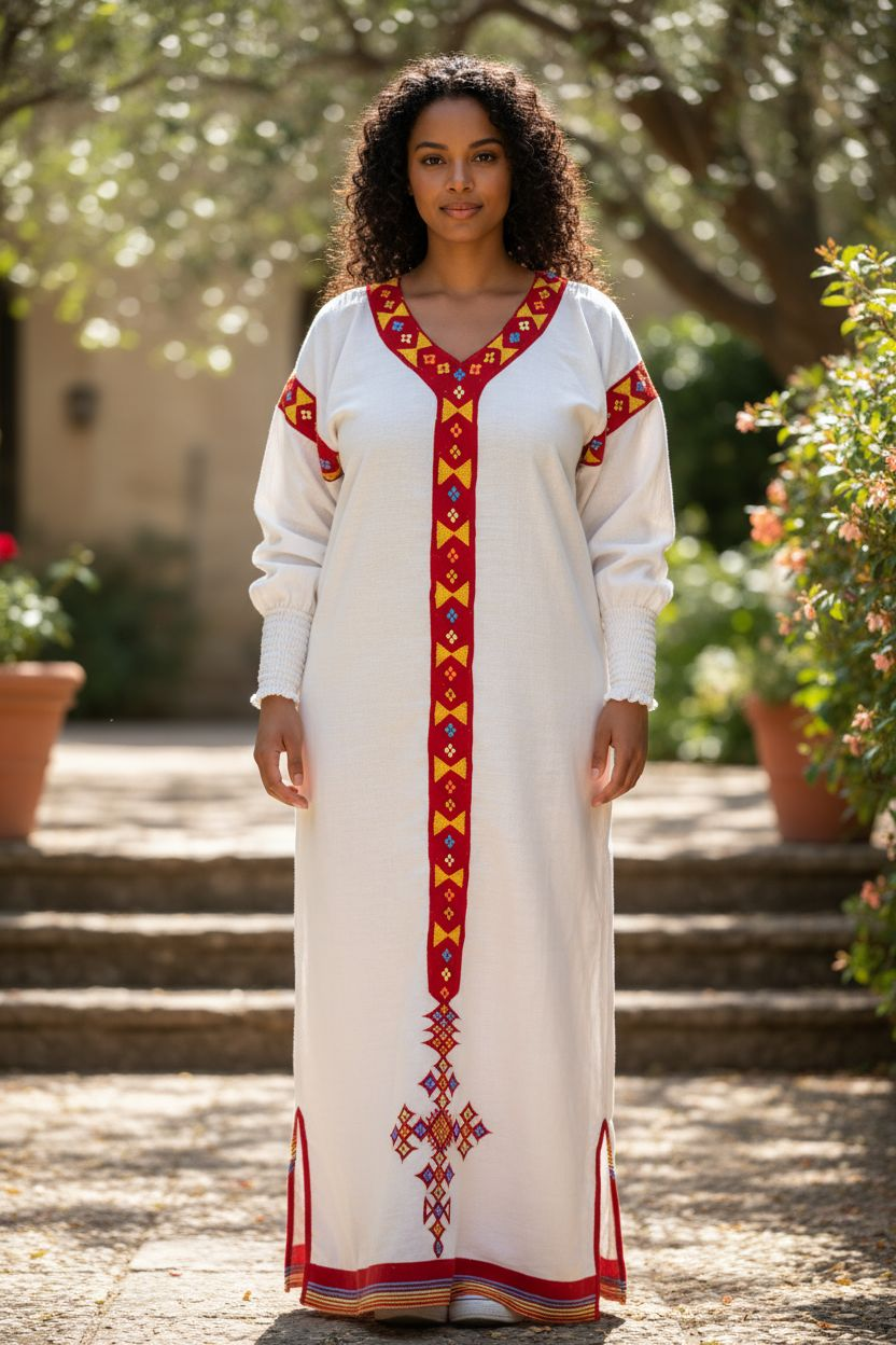 Elegant handwoven white cotton dress featuring bold baby blue accents and traditional Ethiopian cross embroidery — a timeless blend of heritage and modern grace.
